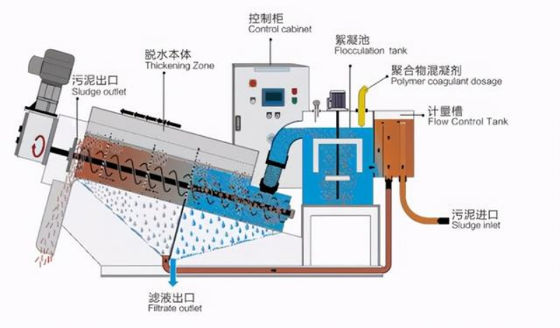 脱水部沿着泥饼排出口的方向螺旋轴的螺距逐渐变小,因为背压板的压缩使主体内的内压变大,达到脱水的目的,脱水后以泥饼的方式排出。