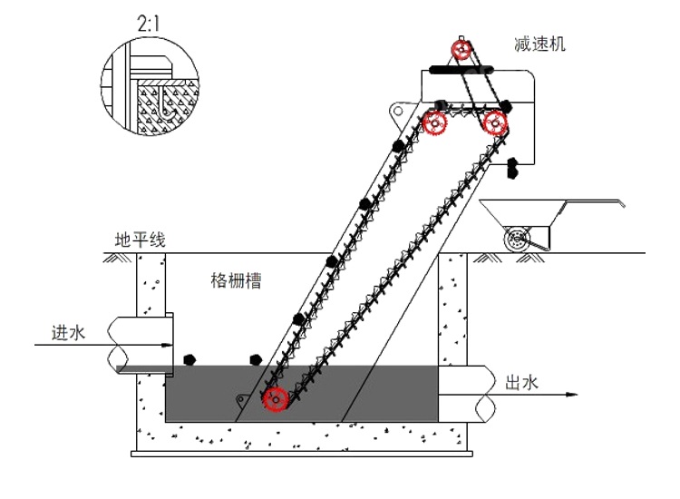 耙齿链运转到设备的上部时,由于槽轮和弯轨的导向,使每组耙齿之间产生相对自清运动,绝大部分固体物质靠重力落下。另一部分则依靠清扫器的反向运动把粘在耙齿上的杂物清扫干净。